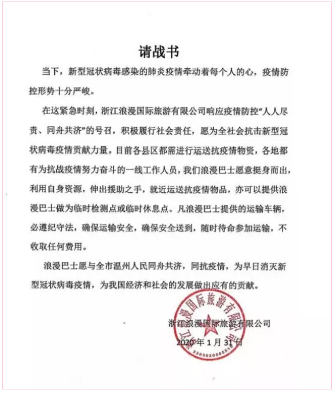 “我们的车可以输送一些物资,或者可以当作卡点的临时休息站。”时刻关注政府防疫工作的周小克想到自己公司大巴车辆充足,大巴车可以进行物资运输以及作为人员休息场所,便立即发动空闲在家的驾驶员,投入疫情防控阻击战。1月31日,周小克赶忙制作出电子稿请战书,发向各个政府单位。