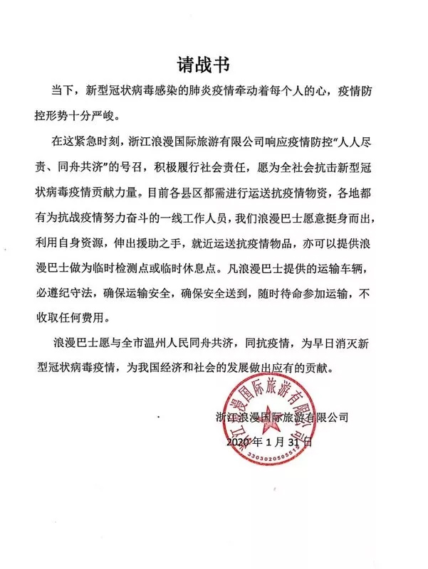 此外,温州浪漫国旅等旅行社主动请缨,充分利用企业自身优势,承诺免费将旅游车辆交相关部门和街道社区统一调度,就近运送工作人员或防疫物资,为这场没有硝烟的战役贡献温州文旅人的一腔热情和一份力量。