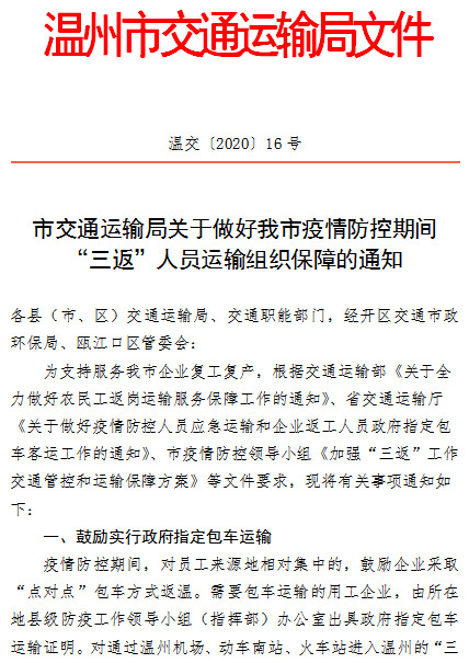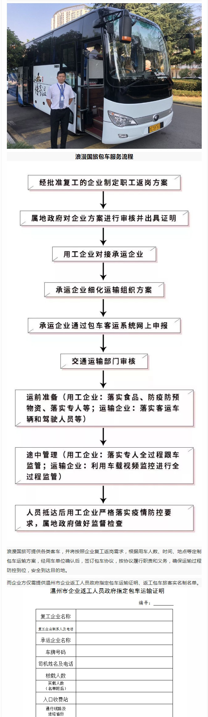 为切实做好疫情防控工作和交通运输保障工作,根据温州市交通运输局文件《市交通运输局关于做好我市疫情防控工作期间“三返”人员运输组织保障的通知》文件,结合当前温州疫情防控工作部署,为有效解决疫情防控期间企业开复工需求,浙江浪漫国际旅游有限公司特推出企业复工包车服务,全力保障各行业的员工返岗返工及出行需求,员工直达企业,无中转,为企业复工复产助力。